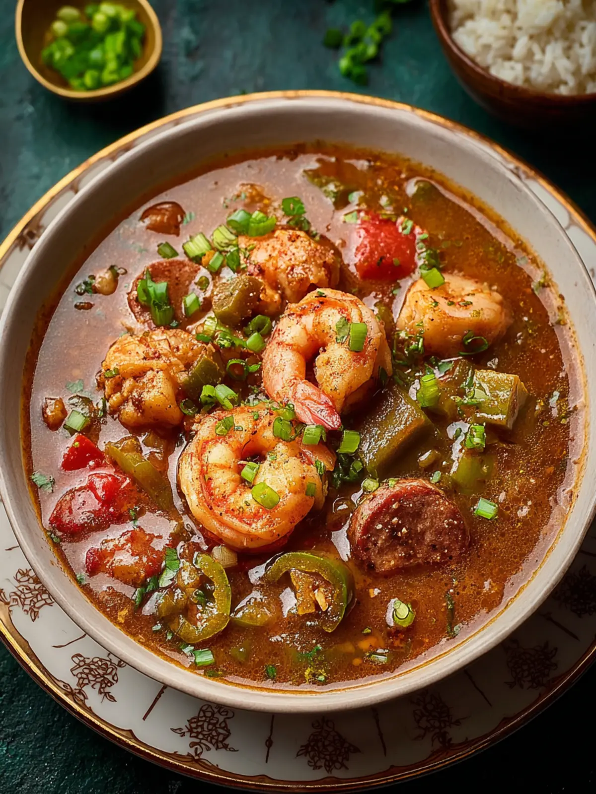 A flavorful Cajun dish with chicken, sausage, and okra served over rice.