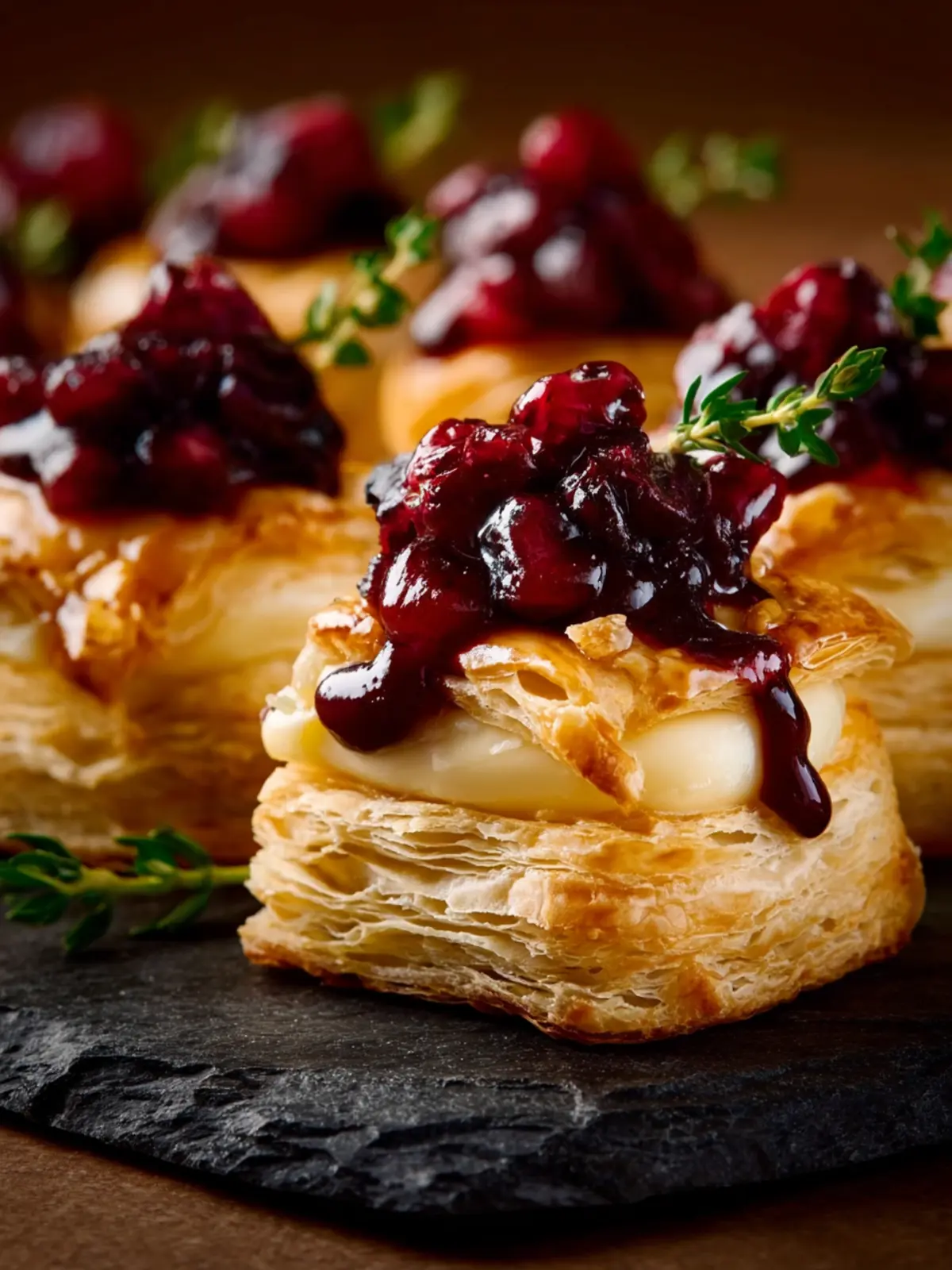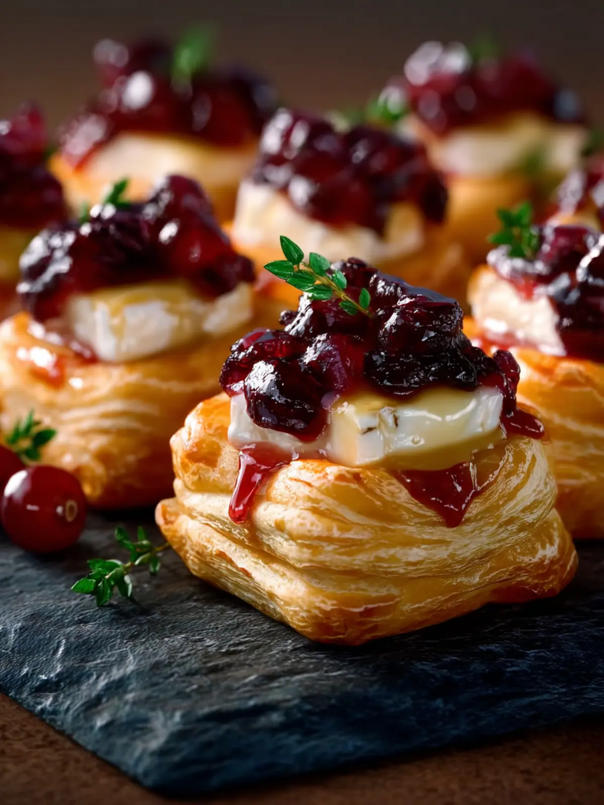 A delicious appetizer featuring flaky puff pastry filled with melted Brie and cranberry sauce, topped with fresh thyme.