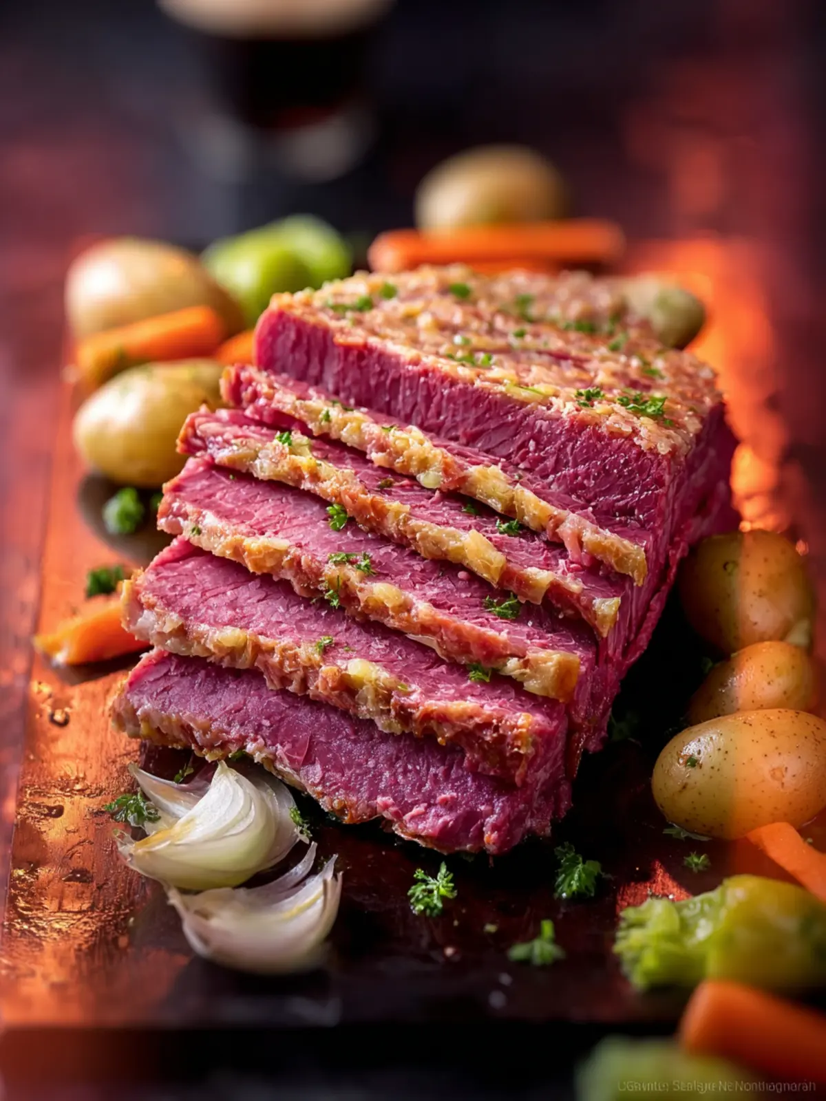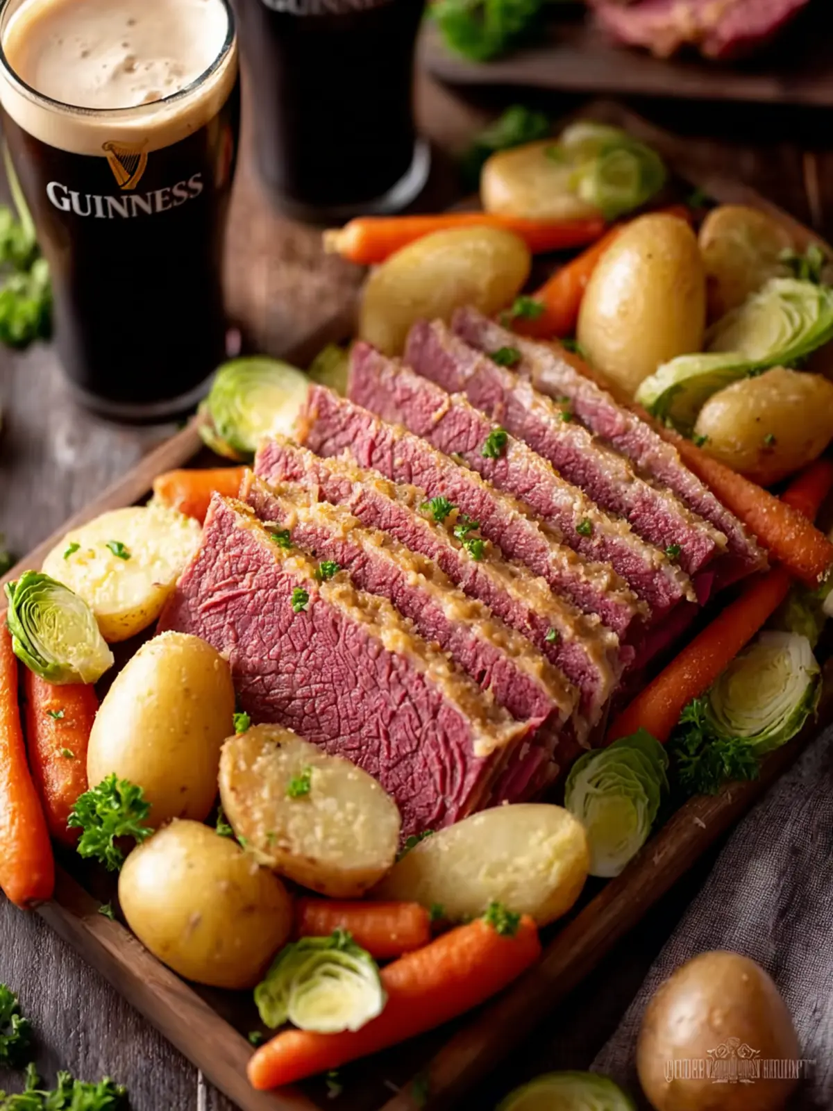 A savory corned beef dish slow-cooked with Guinness and vegetables for a hearty meal.