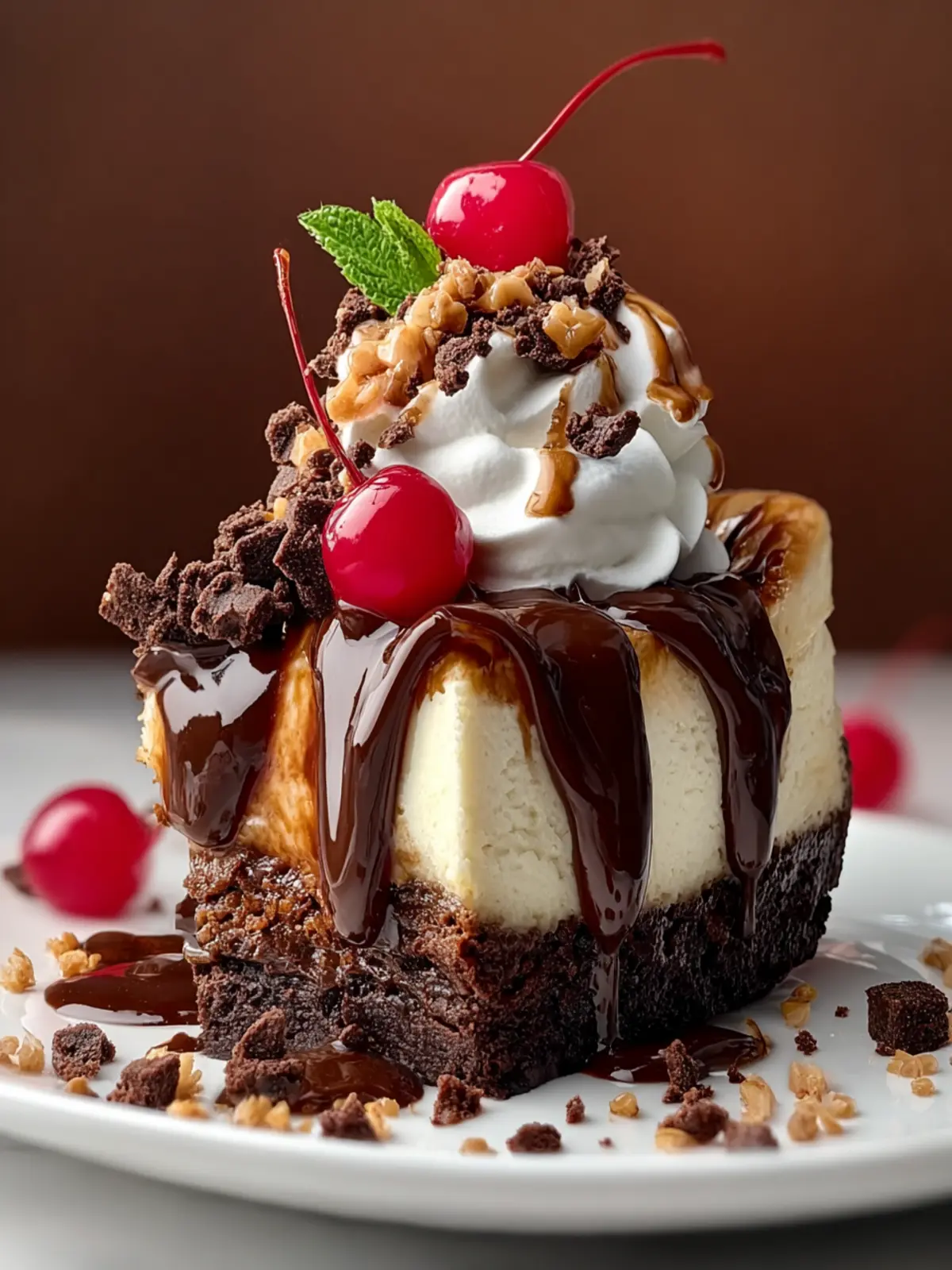 The beauty of the hot fudge sundae brownie cheesecake lies not only in its flavor but also in its presentation. Layered elegantly, it boasts a brownie base that is both dense and fudgy, topped with a smooth, creamy cheesecake filling and finished with a generous drizzle of warm hot fudge. The contrast of textures is simply irresistible—the chewy brownie, the creamy cheesecake, and the silky fudge come together in perfect harmony.