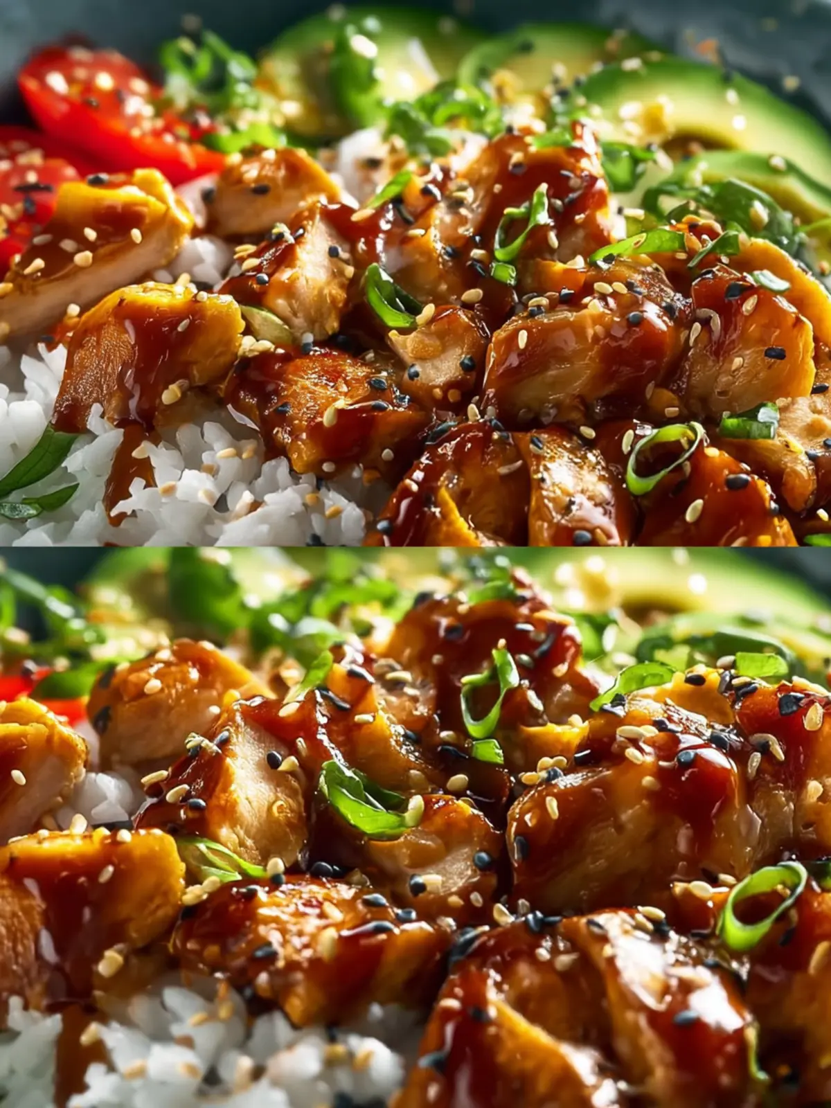 A delicious glazed chicken dish served over rice with fresh vegetables.