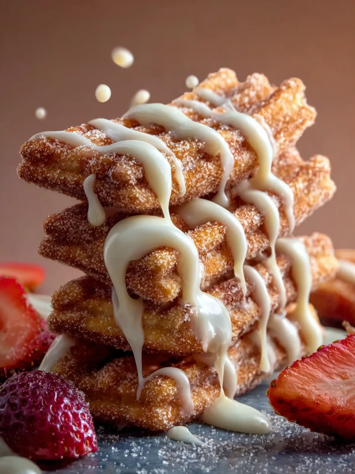 Sugar and Cinnamon: A mixture of granulated sugar and cinnamon is sprinkled generously over the melted chocolate. This classic pairing not only adds sweetness but also mimics the iconic flavors of fried churros.